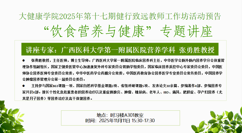 大健康学院诚邀您参加2025年第十七期健行致远教师工作坊活动,预告如下: