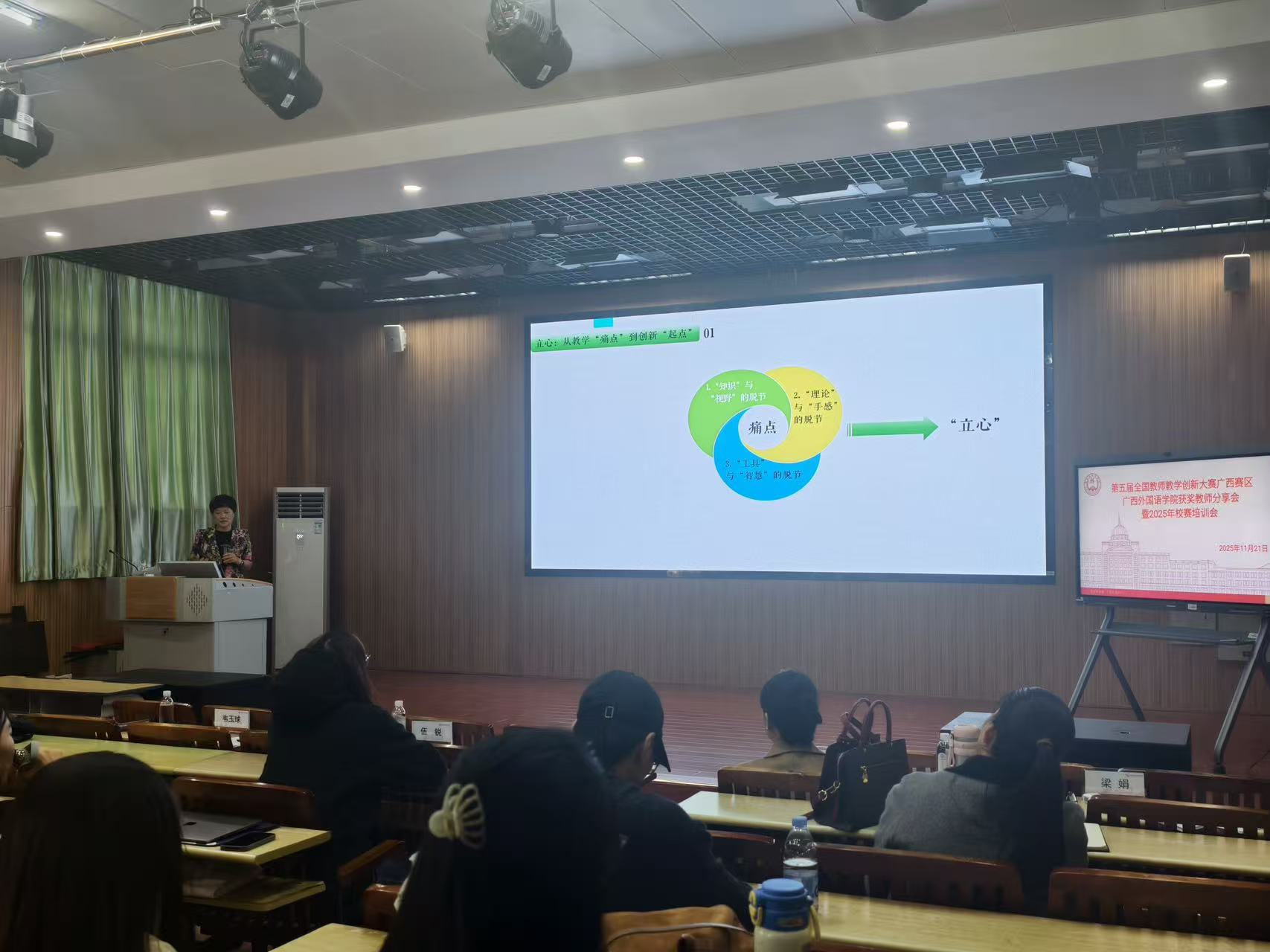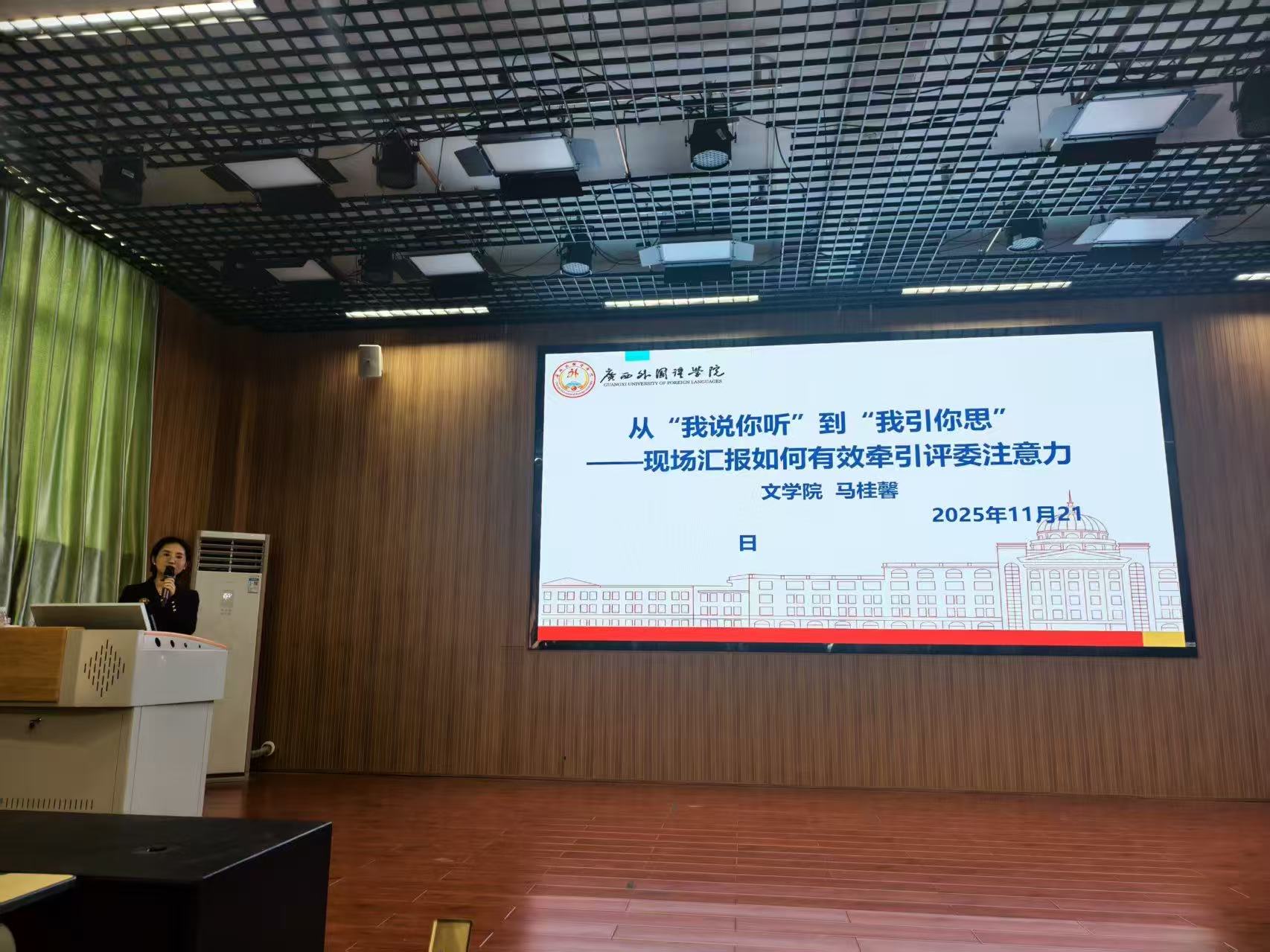 11月21日下午,广西外国语学院教师发展中心在五合校区明德楼110多功能学术报告厅组织开展“第五届全国教师教学创新大赛(广西赛区)广西外国语学院获奖教师分享会暨2025年教创赛校赛培训会”。参会人员有:第五届教学创新大赛获奖教师:国际传媒学院李幸芷老师、文学院马桂馨老师、数字经济管理学院梁娟老师、教育学院赖春晖老师及各学院推荐参加25年教创赛校赛团队教师和对赛事感兴趣的教师;副校长伍锐教授出席,教师发展中心副主任韦玉球教授主持。
