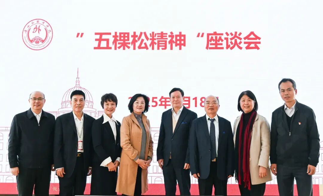 2024年,覃海生院长(左二)荣获广西外国语学院“五棵松常青奖”
