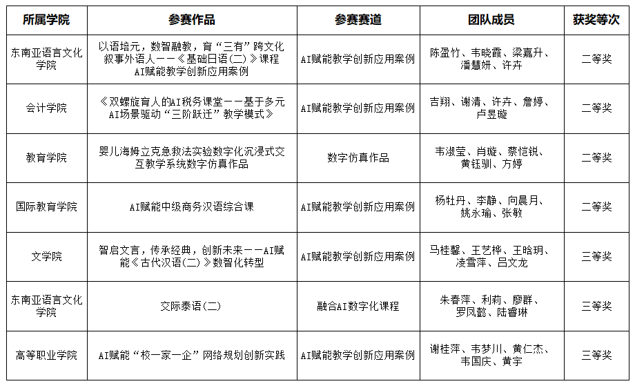 2025年12月23日,由广西壮族自治区教育厅主办的第二十四届广西高校教育教学数字化大赛公布获奖名单,我校7个教师团队在本次大赛中斩获二等奖4项、三等奖3项。展现了我校在人工智能浪潮下对教育教学的积极探索与扎实成效。